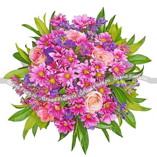 Собранный из милейших фиолетовых хризантем букет выгодно дополнен розовыми розами и статицей. Оформлена очаровательная композиция с помощью фетровой обертки в тон цветам. Столь безупречный букет подойдет на подарок какой угодно женщине, будь то Ваша бабушка или девушка. Лиловое изящество поможет завоевать внимание интересующей Вас женщины.