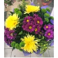 Уменьшенный: хризантема одноголовая (желтая) - 1 шт., хризантема зеленая кустовая - 2 шт., хризантема фиолетовая кустовая - 2 шт., солидаго - 1 шт., фетр фиолетовый, крафт, лента. Примерный диаметр букета 25х25 см.