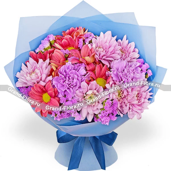 Стандартный: гвоздика фиолетовая - 4 шт., хризантема кустовая красная - 2 шт., хризантема кустовая фиолетовая - 3 шт., статица, упаковка, лента.