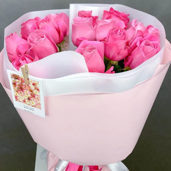 Розовый букет из роз – это воплощение женственности, романтики и нежности. Каждый цветок, словно создан для того, чтобы выразить самые теплые и искренние чувства. Мягкие пастельные оттенки розового цвета придают букету лёгкость и воздушность, напоминая о первых лучах рассвета или нежном румянце на щеках.