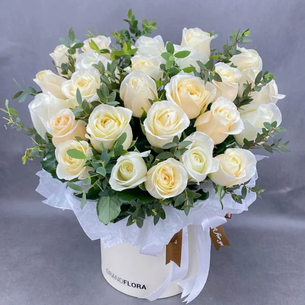 25 роз: роза белая (Россия) 50 см.,- 25 шт., коробка круглая средняя (20*30) - 1 шт., эвкалипт, оазис.