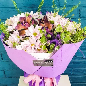Букет очень аккуратный , нежный и красивый! Маме заказывала в качестве подарка на День рождения - очень понравился! Спасибо за хорошую доставку.